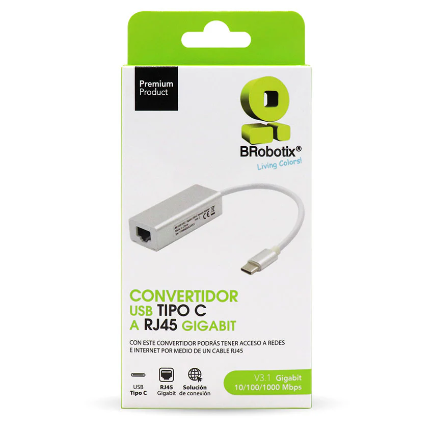 - Convertidor USB V3.1 Tipo "C" a RJ45 BRobotix podrás tener acceso a redes e internet por medio de un cable RJ45.